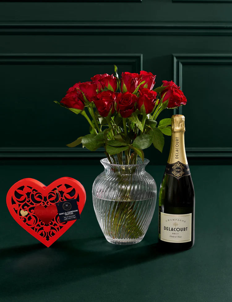 Dozen Red Rose Bouquet, Delacourt Brut Champagne & Chocolate Bundle (The Truffle Collection (Marc de Champagne))