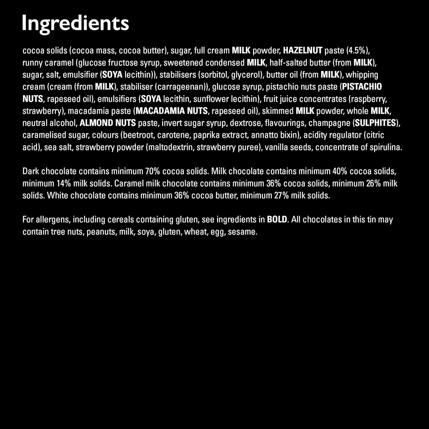 Ingredients: cocoa solids (cocoa mass, cocoa butter), sugar, full cream MILK powder, HAZELNUT paste, runny caramel (glucose fructose syrup, sweetened condensed MILK, half salted butter (from MILK), sugar, salt, emulsifier (SOYA lecithin)), stabilisers (sorbitol, glycerol), butter oil (from MILK), whipping cream (cream (from MILK), stabiliser (carrageenan)), glucose syrup, pistachio nuts paste (PISTACHIO NUTS, rapeseed oil), emulsifiers (SOYA lecithin, sunflower lecithin), fruit juice concentrates (raspberry, strawberry), macadamia paste (MACADAMIA NUTS, rapeseed oil), skimmed MILK powder, whole MILK, neutral alcohol, ALMOND NUTS paste, invert sugar syrup, dextrose, flavourings, champagne (SULPHITES), caramelised sugar, colours (beetroot, carotene, paprika extract, annatto bixin, concentrate of spirulina), acidity regulator (citric acid), sea salt, strawberry powder (maltodextrin, strawberry puree), vanilla seeds. Dark chocolate contains minimum 70% cocoa solids. Milk chocolate contains minimum 40% cocoa solids, minimum 14% milk solids. White chocolate contains minimum 36% cocoa butter, minimum 27% milk solids. Caramel milk chocolate contains minimum 36% cocoa solids, minimum 26% milk solids. For allergens, including cereals containing gluten, see ingredients in BOLD. All chocolates in this box may contain peanuts, tree nuts, milk, soya, wheat, gluten, egg, sesame.