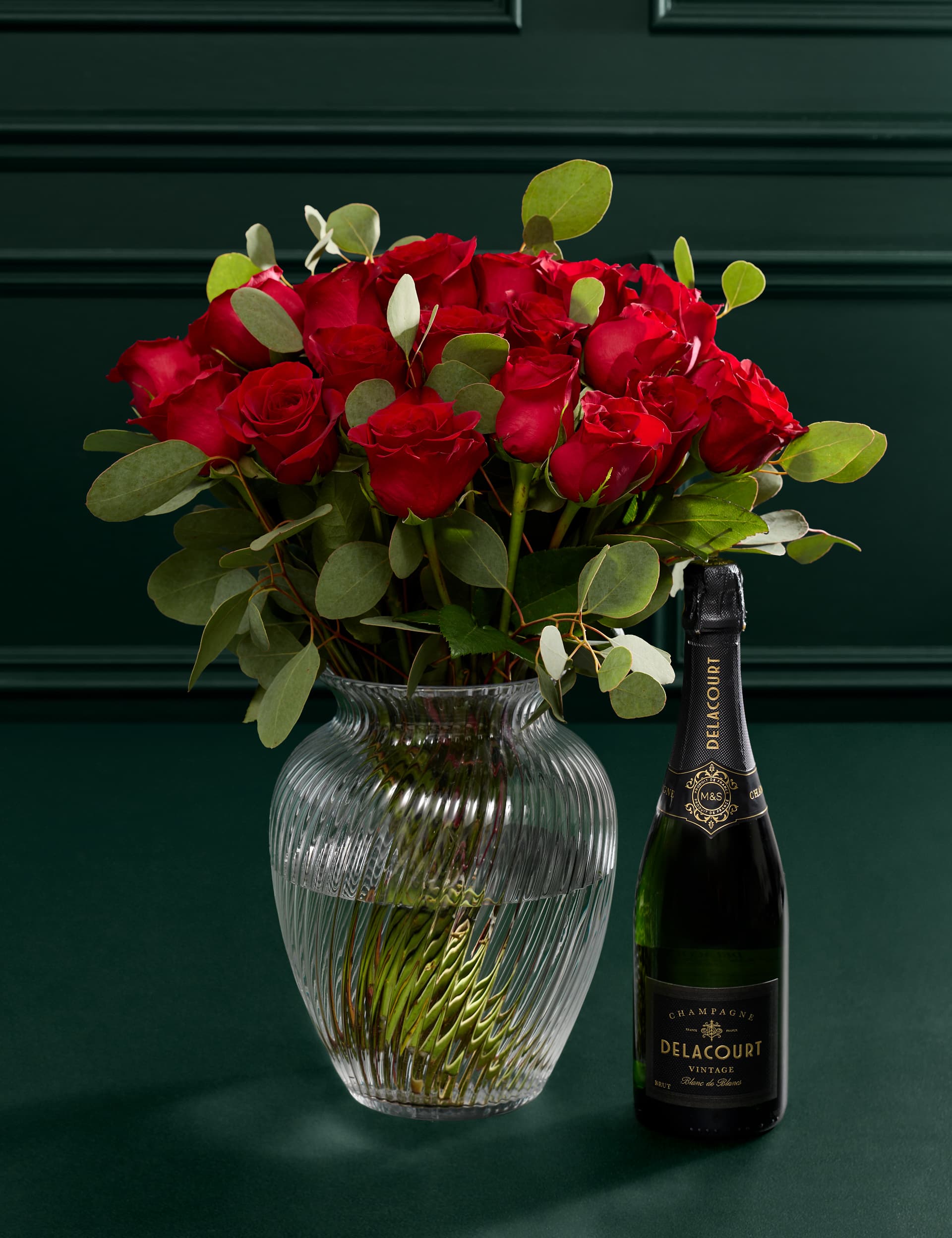 Red Freedom® Rose & Eucalyptus Bouquet with Vintage Champagne
